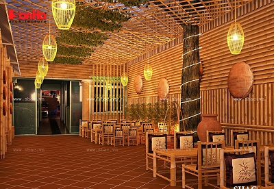 Thiết kế nhà hàng khách sạn phong cách đồng quê sử dụng như mây tre, nứa, gỗ, cùng với đó là những cây xanh tươi mát giúp cho khách hàng đến đây không chỉ đến thưởng thức những món ăn mà còn giúp họ thư giãn tuyệt vời.